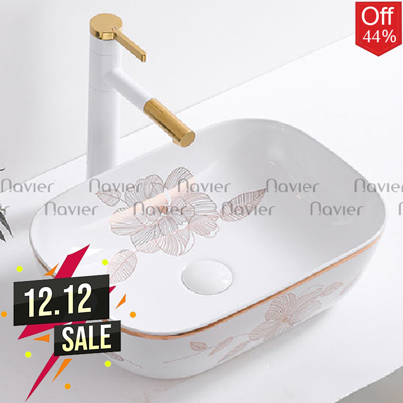 Chậu Lavabo Đặt Bàn Vuông Giác Cạnh Viền Vàng Họa Tiết Hoa Navier NV-435H Đặt online giảm 200.000 đ