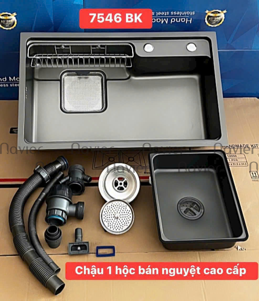 - Chậu rửa chén 1 ngăn lớn SUS 304 chuẩn 100% cao cấp Navier NV-7546BK. Đây là sản phẩm phù hợp nhất cho tủ bếp tại bàn đảo, quầy bar hoặc gian bếp có diện tích bàn bếp hạn chế. Chậu đơn, rộng ngang, lòng chậu sâu giúp mở rộng diện tích thao tác trong hố chậu một cách tối đa.