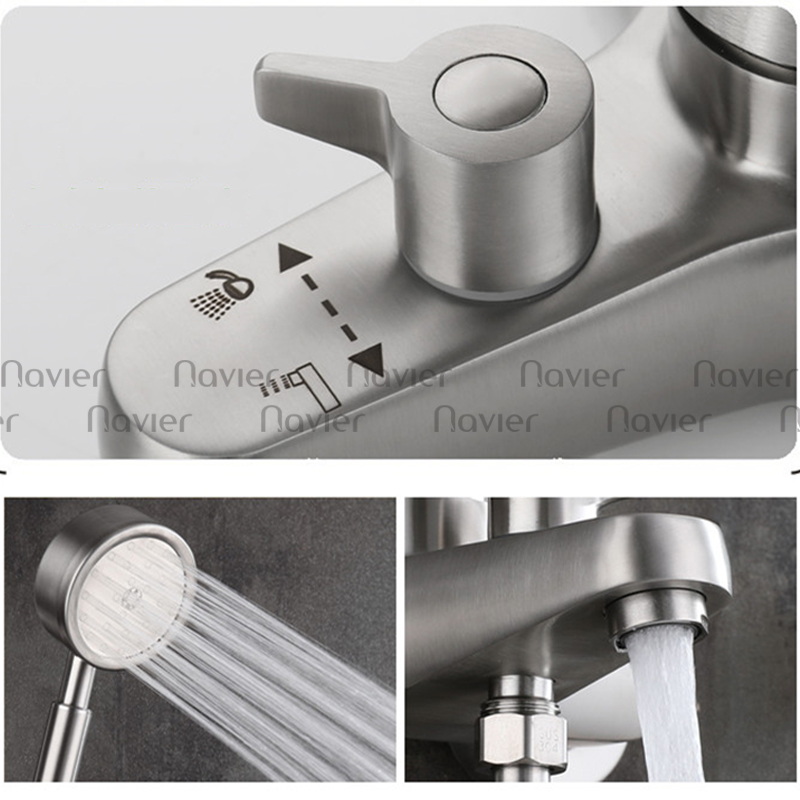- Thiết Kế Hiện Đại, Sang Trọng: Kiểu dáng gọn gàng, đường nét tinh tế cùng bề mặt hoàn thiện cao cấp (thường là xước mờ hoặc bóng) giúp bộ sen tắm Navier NV-8009 dễ dàng hòa hợp với nhiều phong cách thiết kế phòng tắm, từ tối giản đến hiện đại.