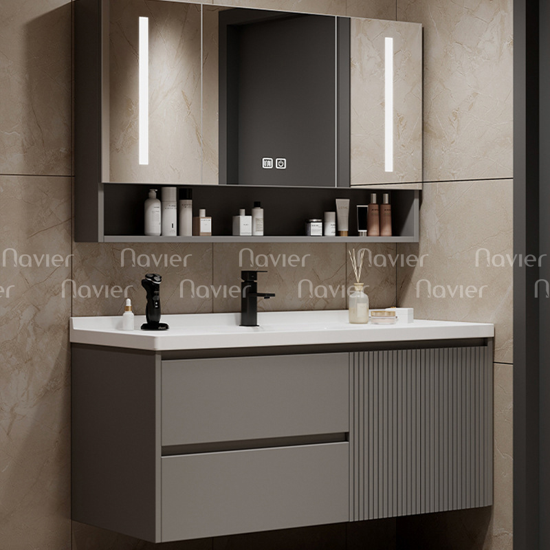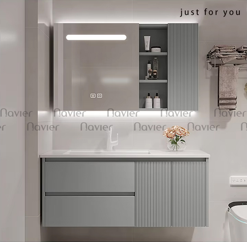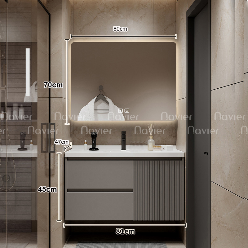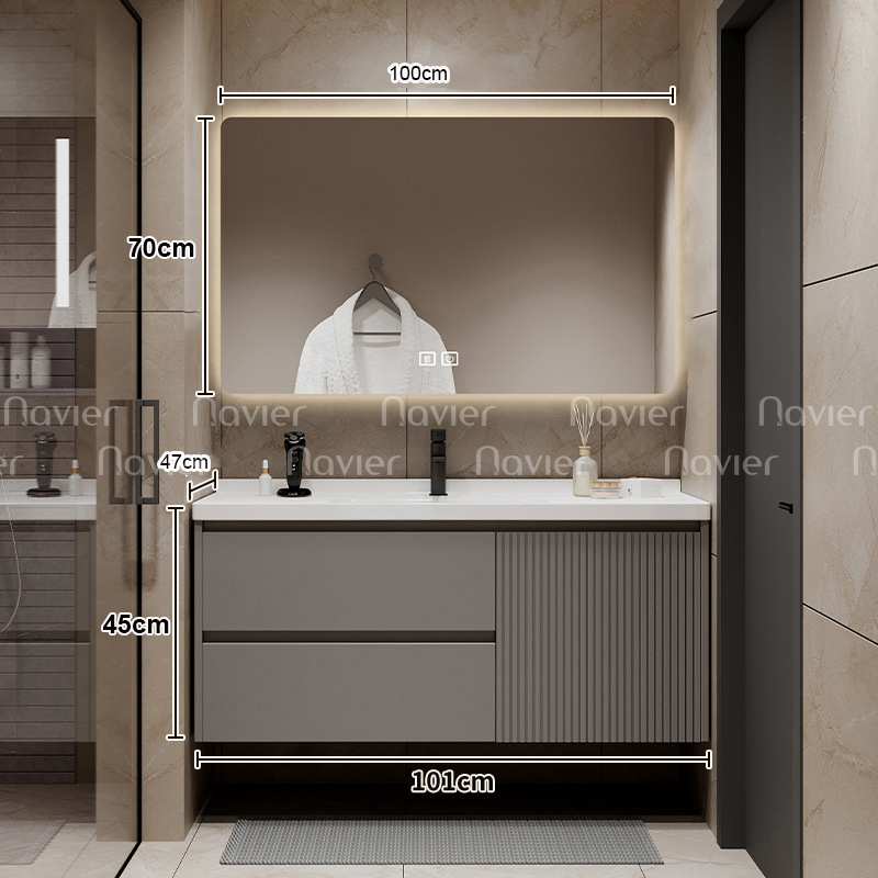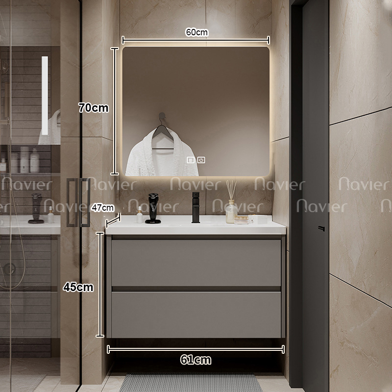 Bộ sản phẩm gồm: Tủ lavabo + chậu lavabo âm + tủ gương LED