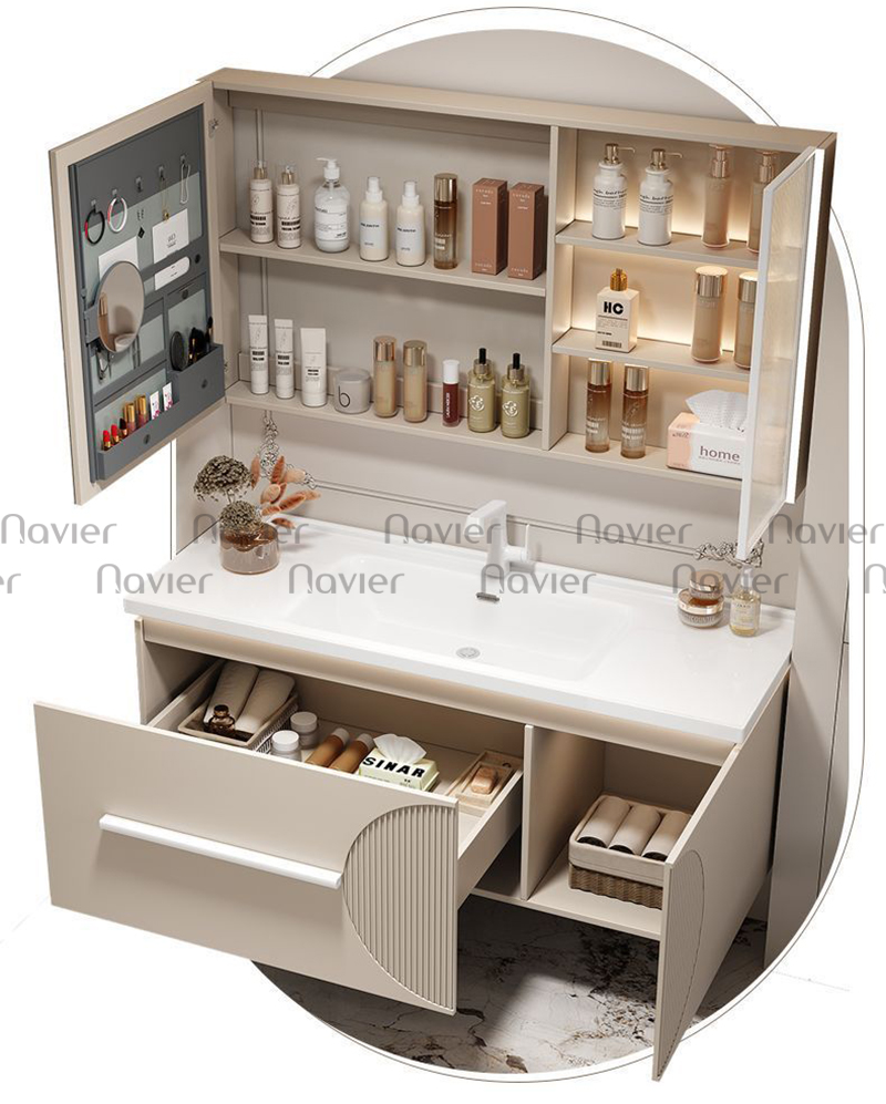 - Ngăn chứa rộng rãi: Thiết kế nhiều hộc tủ giúp lưu trữ gọn gàng khăn tắm, mỹ phẩm, đồ dùng cá nhân.